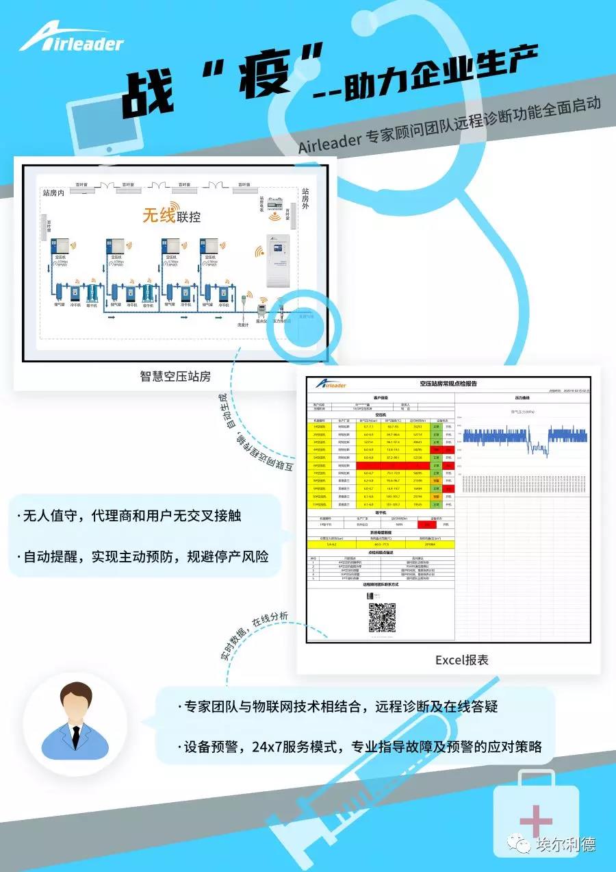 元宵节后企业马上面临复工生产,为保障企业在复工后的正常生产,又避免面对面的服务,710公海积极响应国家号召,为企业用户提供科技支撑。针对空压机系统设备的远程运维,710公海紧急组织专家团队,应用物联网平台的数据,上线了“远程在线诊断”功能,并向企业单位、空压机维护商免费开放,驰援大家更好地进行疫情防控,与大家共渡难关。