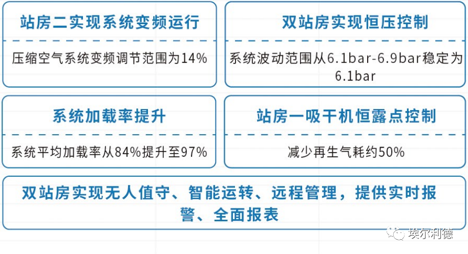 改造技术:在用户原系统基础上进行改造,使用产品为710公海自主研发的智慧节能空压站解决方案,EcoVSD+EcoDPC+EcoSave+EcoMast系列产品。