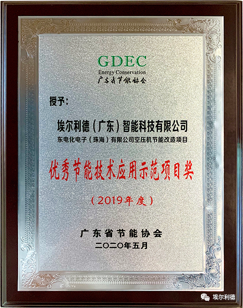 2020年06月23号,广东省节能协会举办了2019年度网络会员大会,大会对2019年度优秀会员企业及个人,优秀示范项目等进行表彰,我司的东电化电子(珠海)有限公司空压机改造项目,荣获优秀节能技术应用示范项目奖。